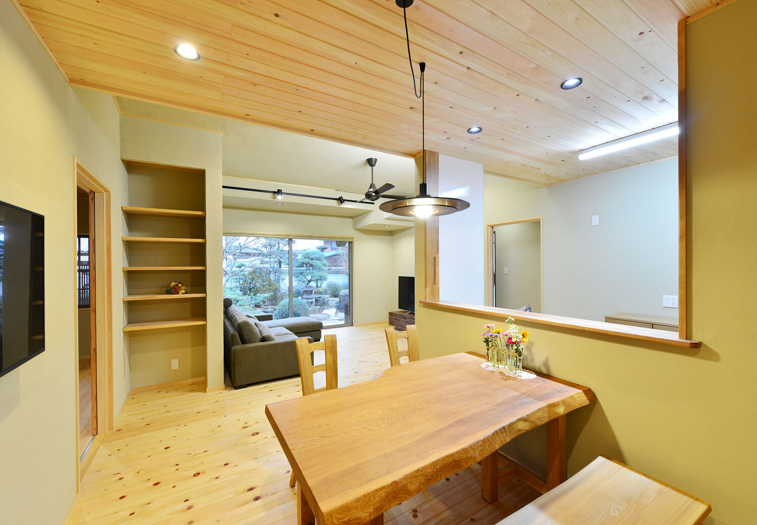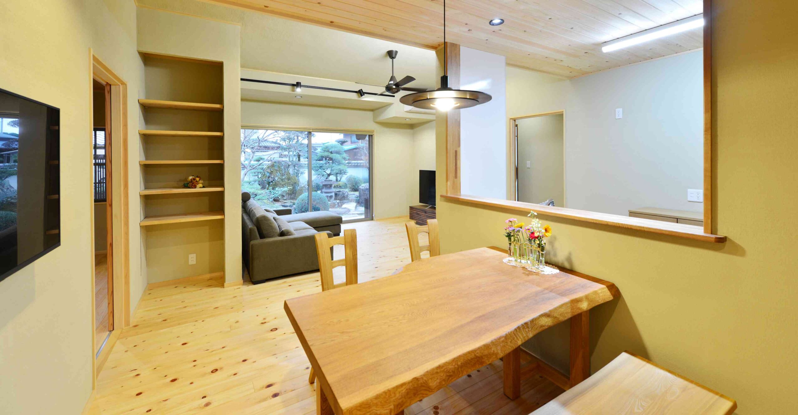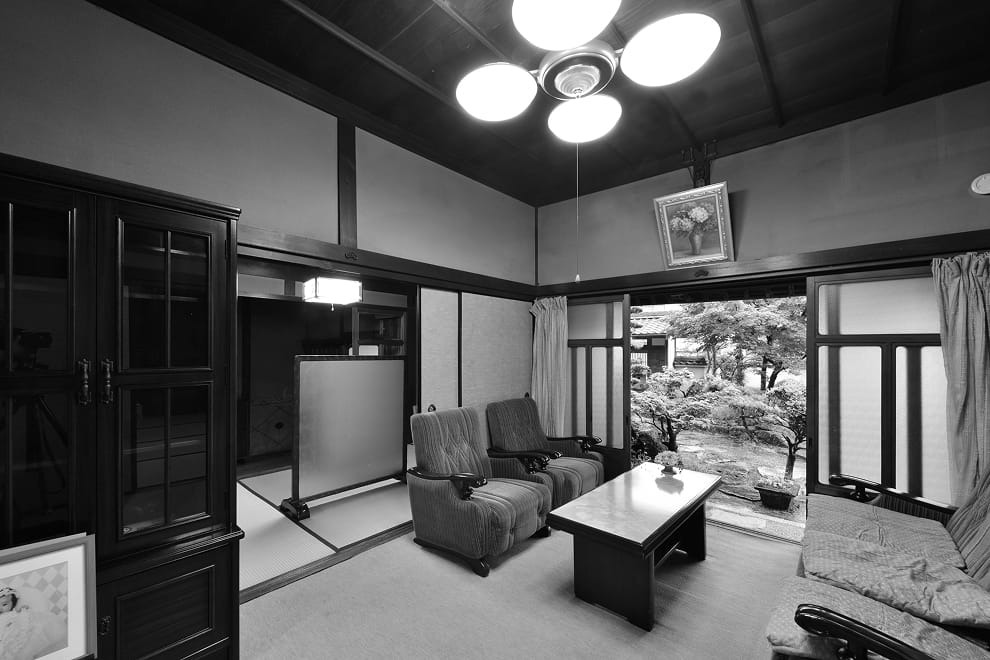 三世代同居のために居住部分をリノベーションしました。2部屋の和室と広縁をひとつにして25畳を超える大きなLDKになりました。床材、天井材に桧、壁はシラス壁で快適に。窓越しに見える和庭園も爽快です。