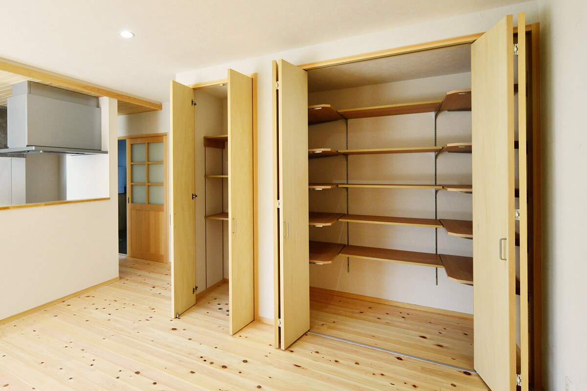 リビングに生活用品が出っぱなしにならないよう、パントリーやバックヤードを含めて、物の逃げ場をつくることも工夫のひとつです。家事の途中でも一旦片付けられる場所があると、気持ちに余裕が生まれます。家族が増えたり生活リズムが変わったりしても散らかりにくい、暮らしの土台を意識したこだわりでした。