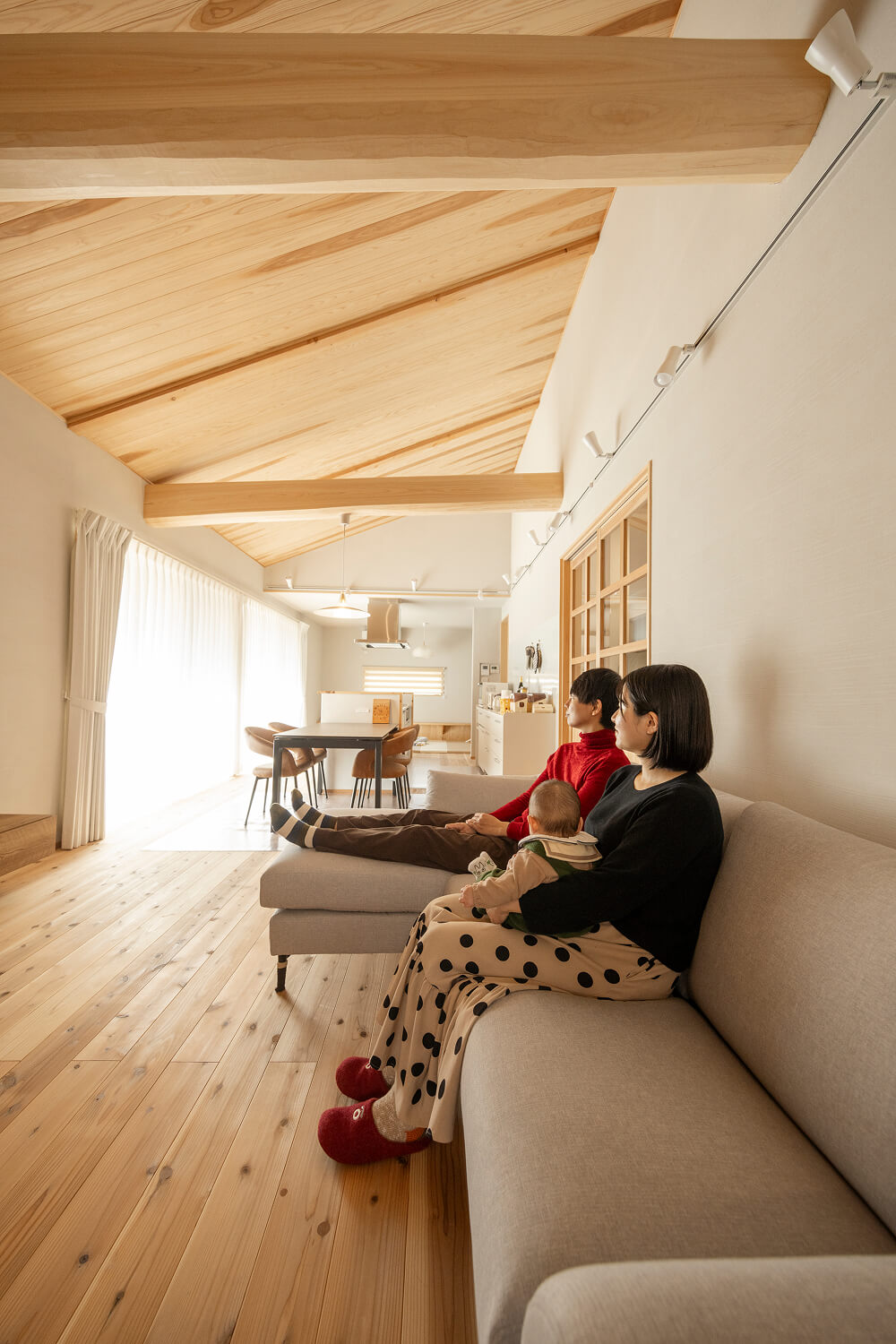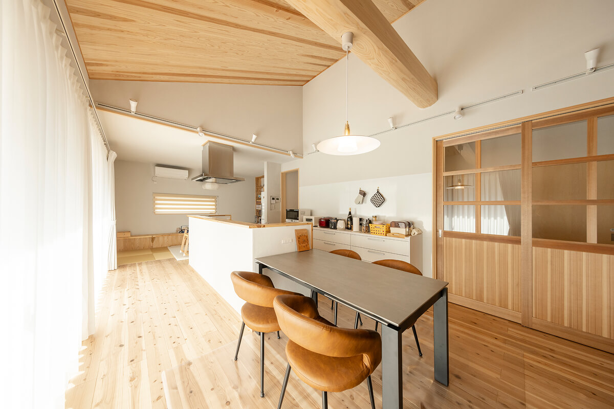 K様が家づくりで思い描いていたのは、太鼓梁が見えるリビングで家族がゆるやかにつながる暮らしでした。