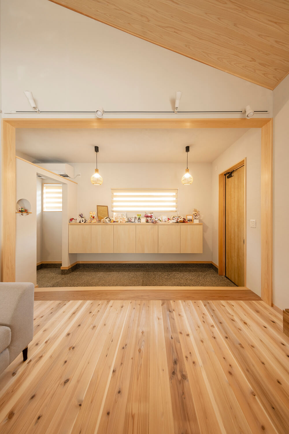 リビングのソファに腰を下ろし、太鼓梁と勾配天井を見上げる時間は、いつのまにか家の中で一番落ち着けるひとときになりました。