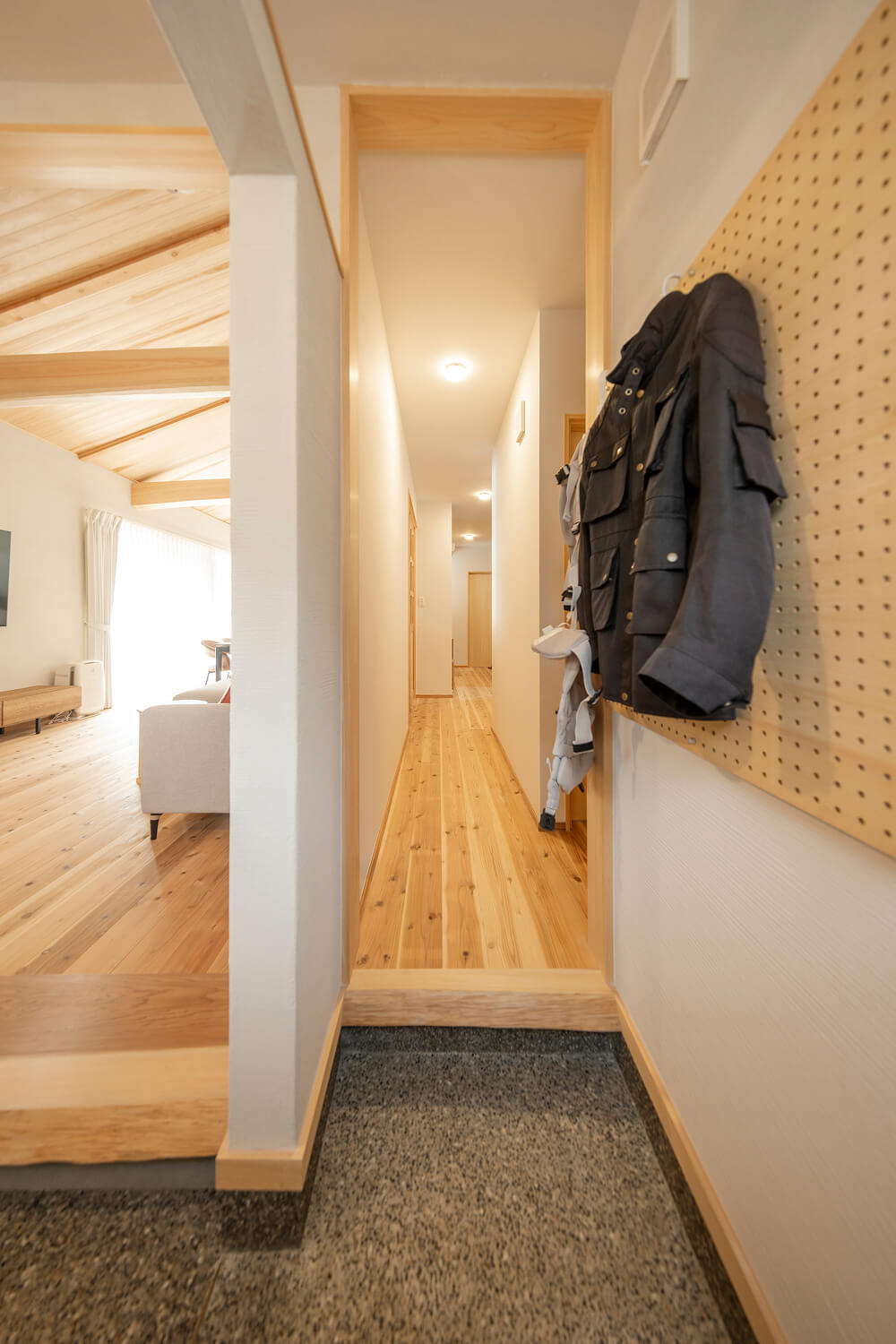 暮らし始めてまず感じたのは、玄関を開けたときにふわっと漂う木の匂いでした。無垢の床は冬でも冷えが少なく、素足で歩いてもやわらかく受け止めてくれるように感じるといいます。