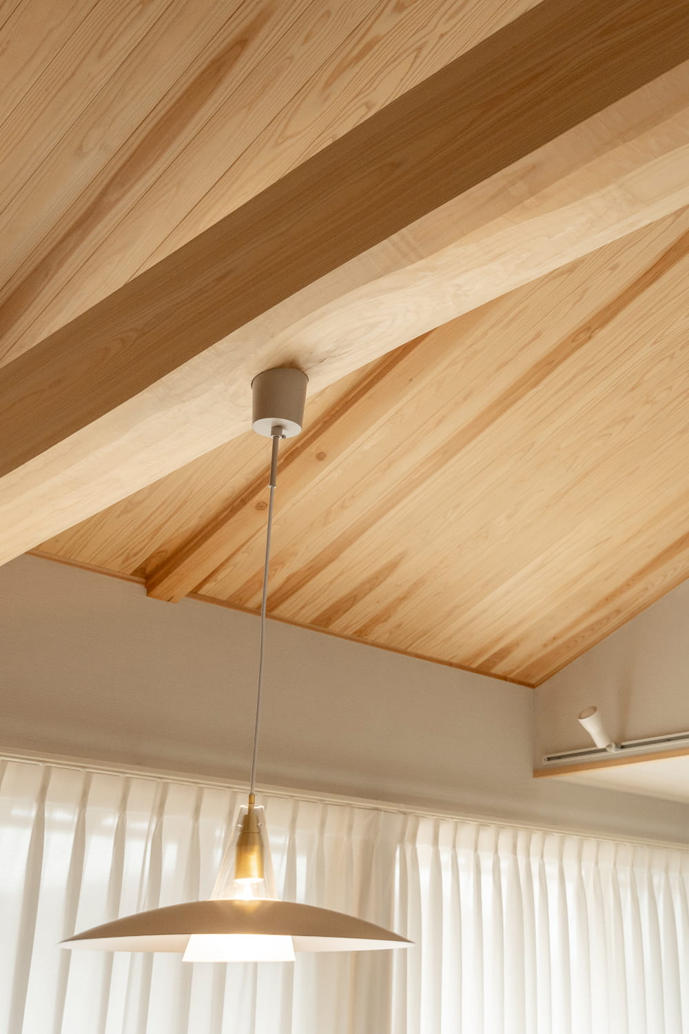 見上げたときに広がる勾配天井は、家づくりの初期からずっと描いていたイメージでした。太鼓梁とともに、この家の中心になる風景です。