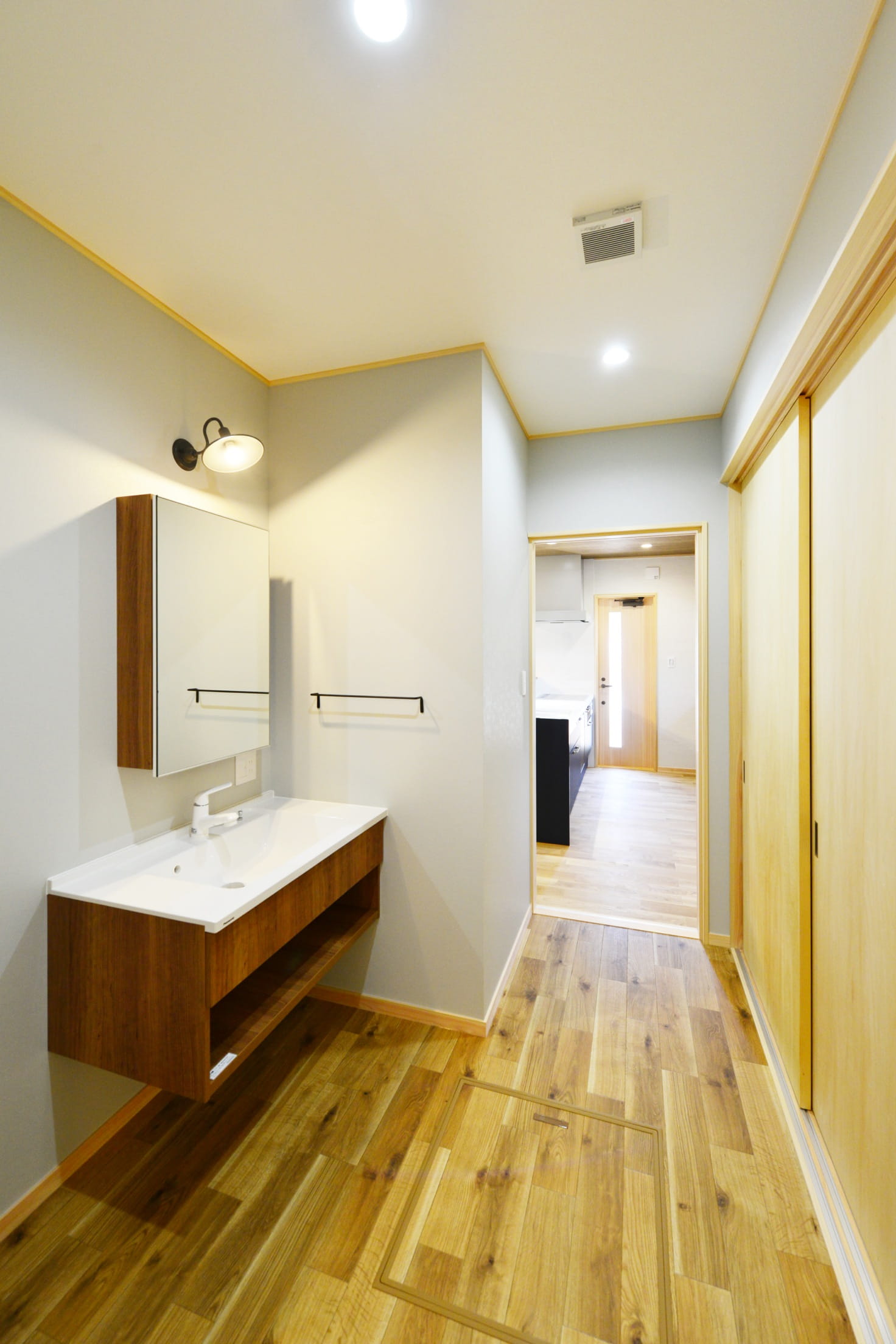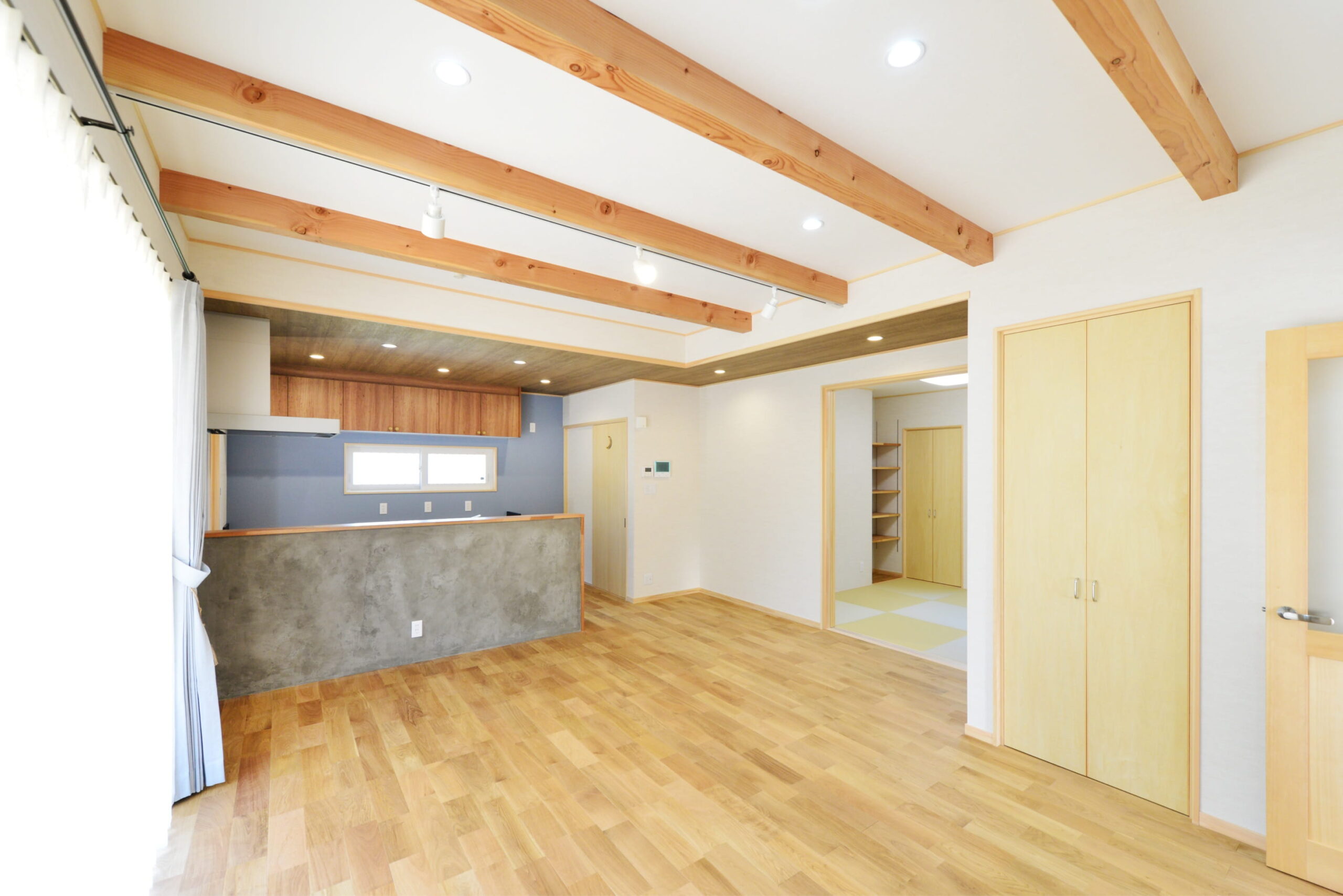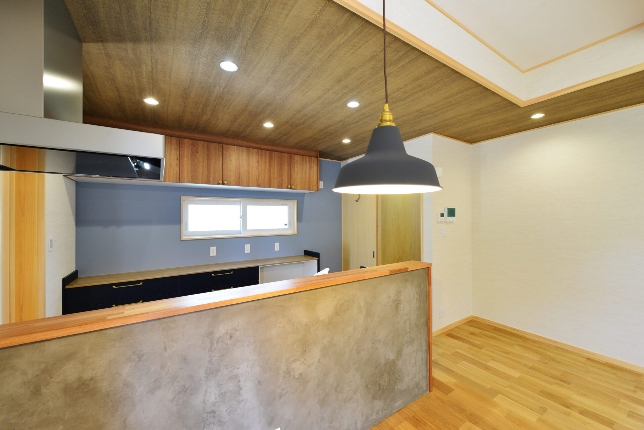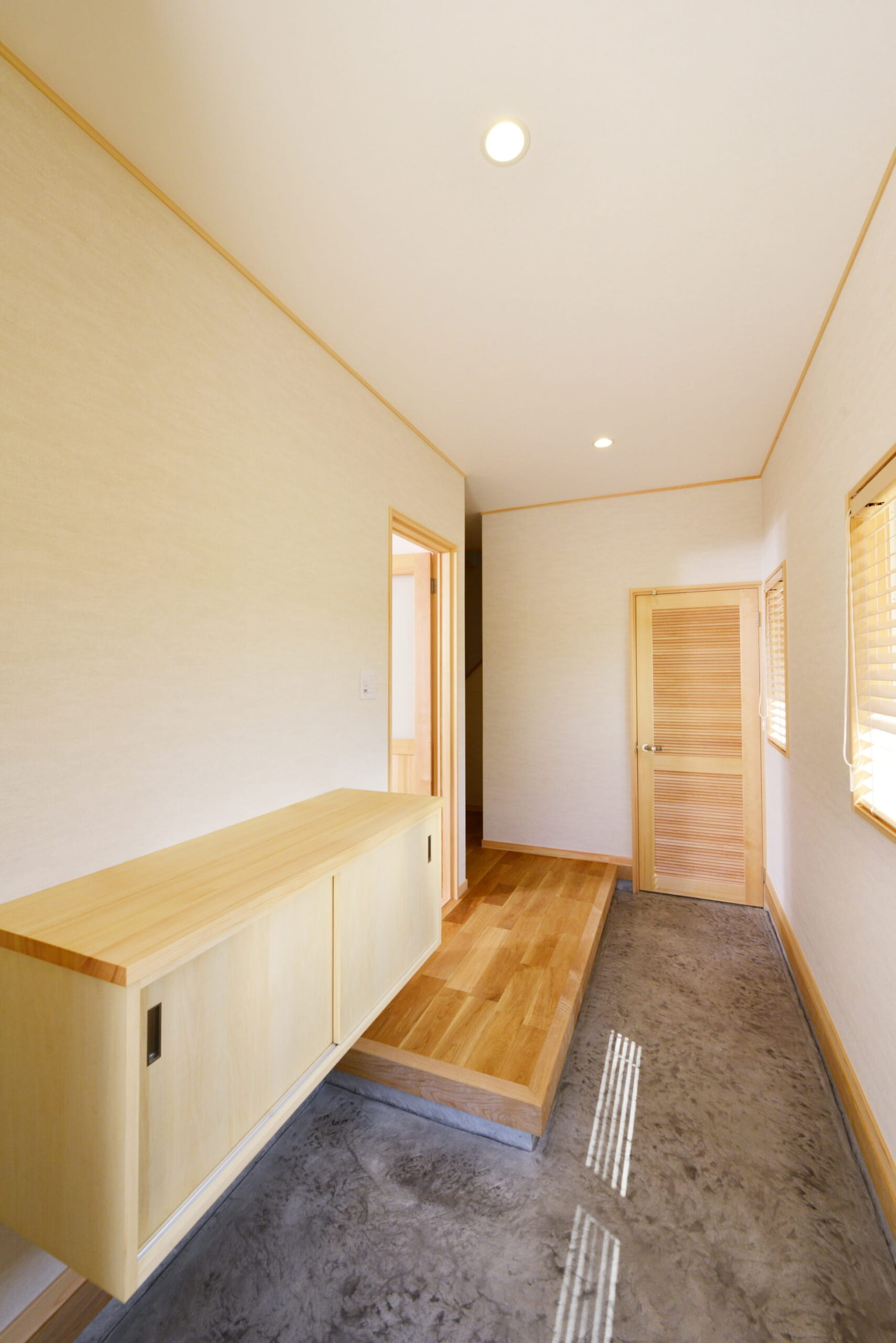玄関内側床とキッチンのクロスの代わりにデザインコンクリートを使っています。