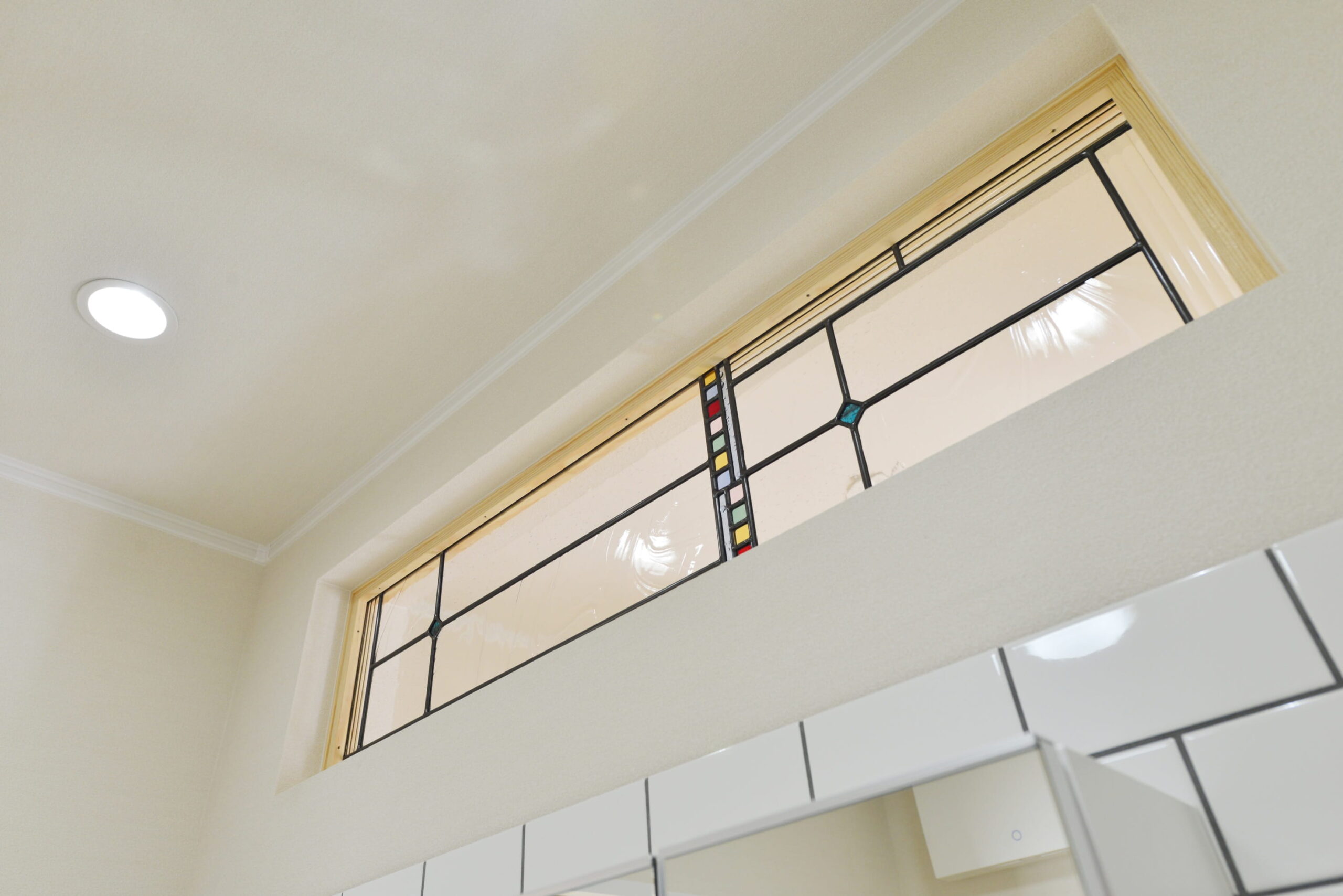 キッチンのカップボードも施主様が高い位置には届かないので使用頻度が少なくなるということで、背面にはマグネットタイプの壁紙を貼り、マグネットで色々貼り付けられるようにしました。