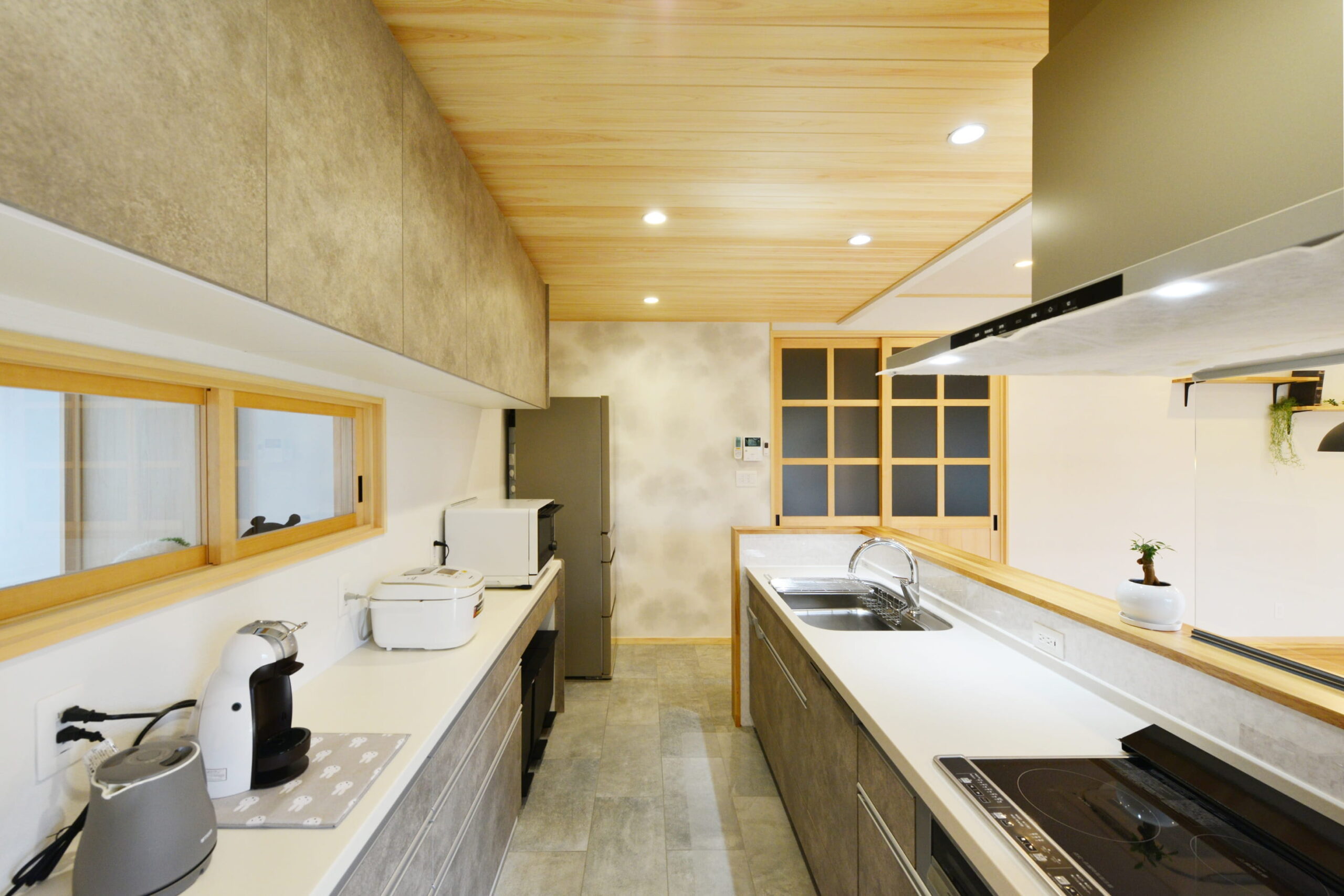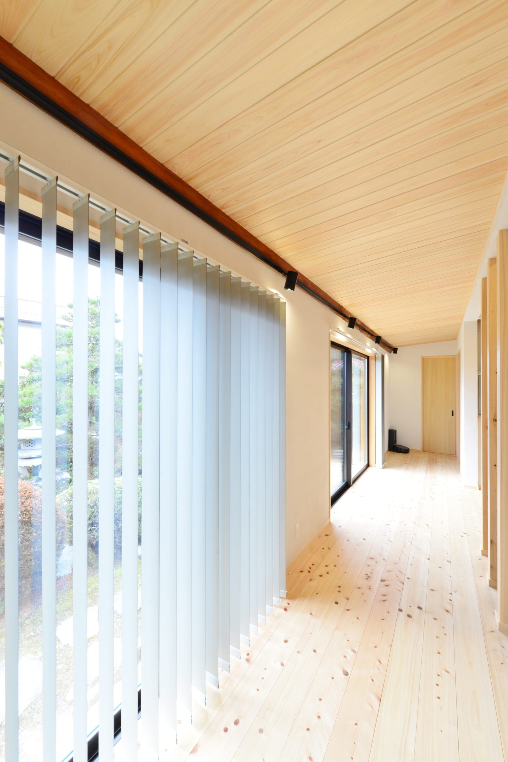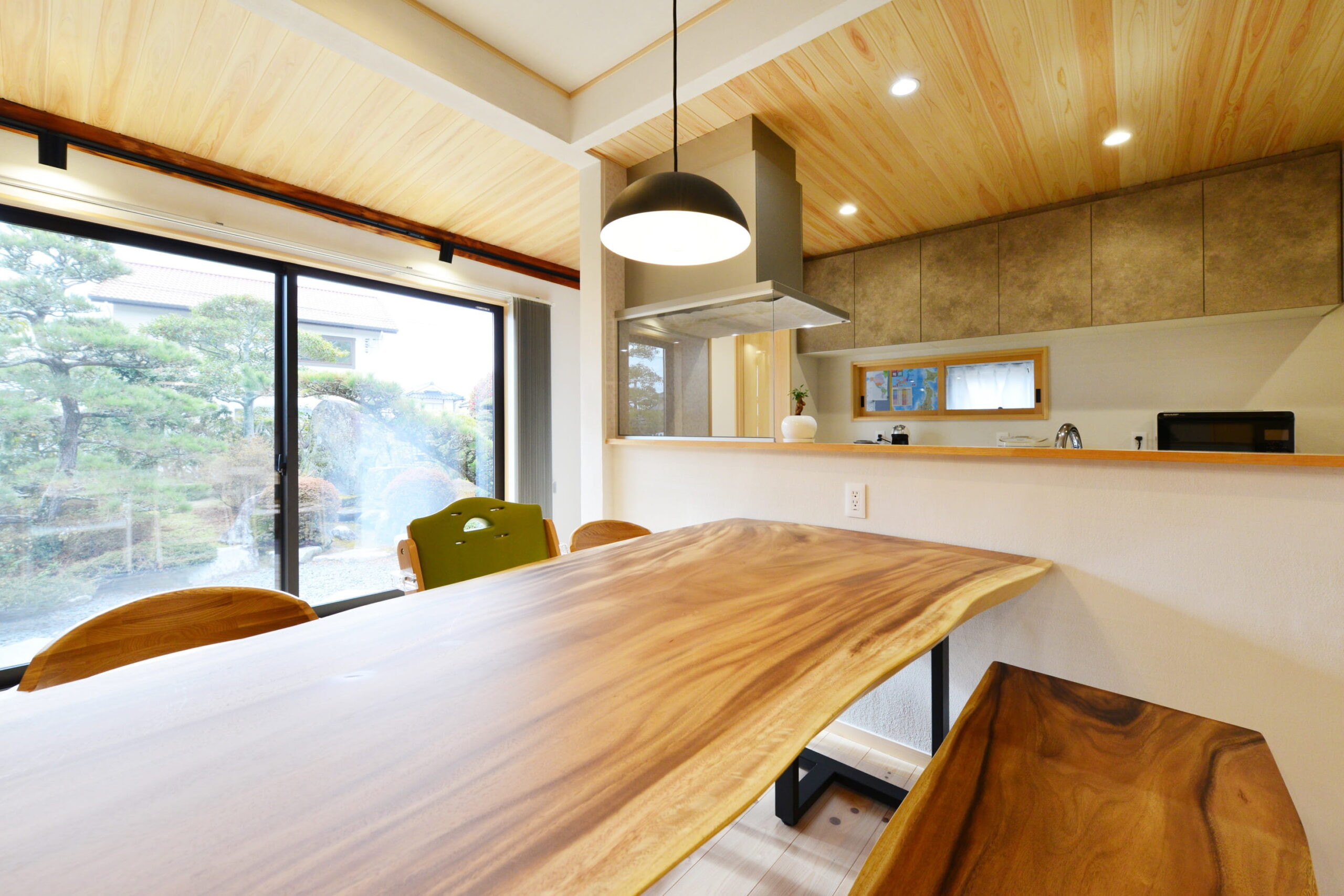 床材、天井材に桧、壁はシラス壁で快適に。窓越しに見える和庭園も爽快です。