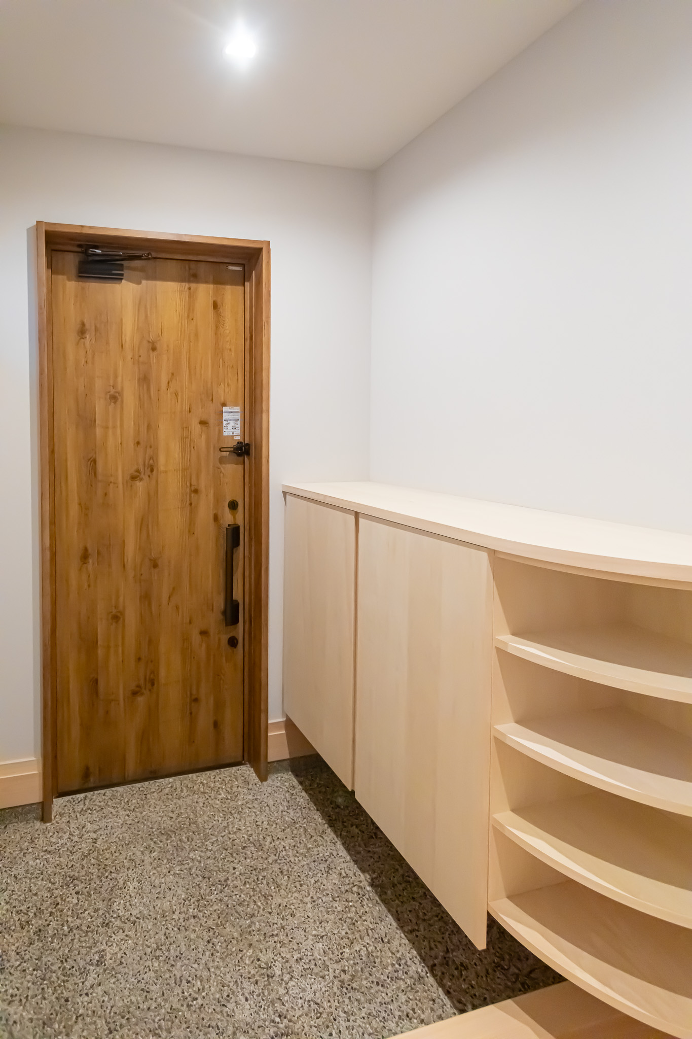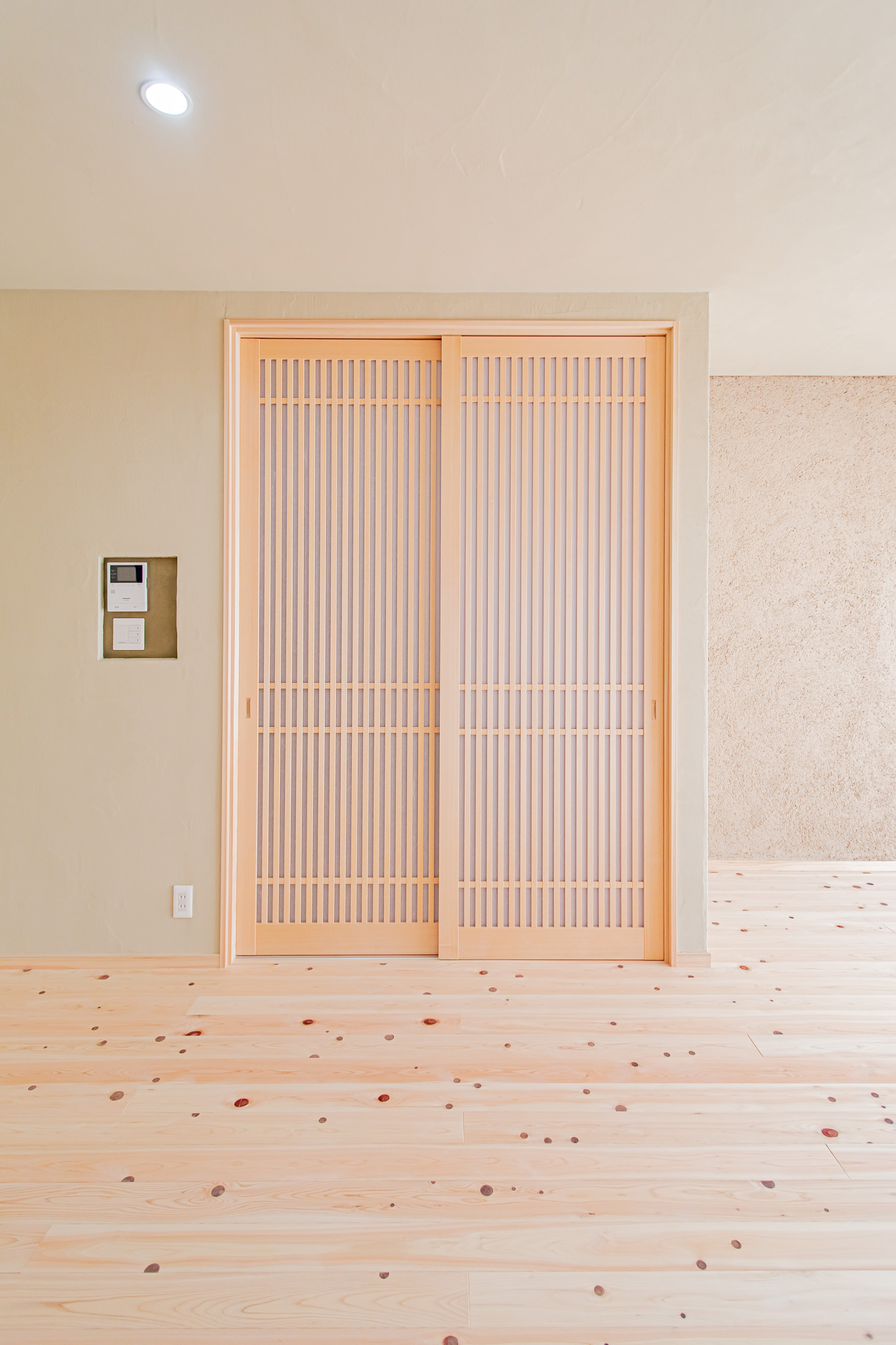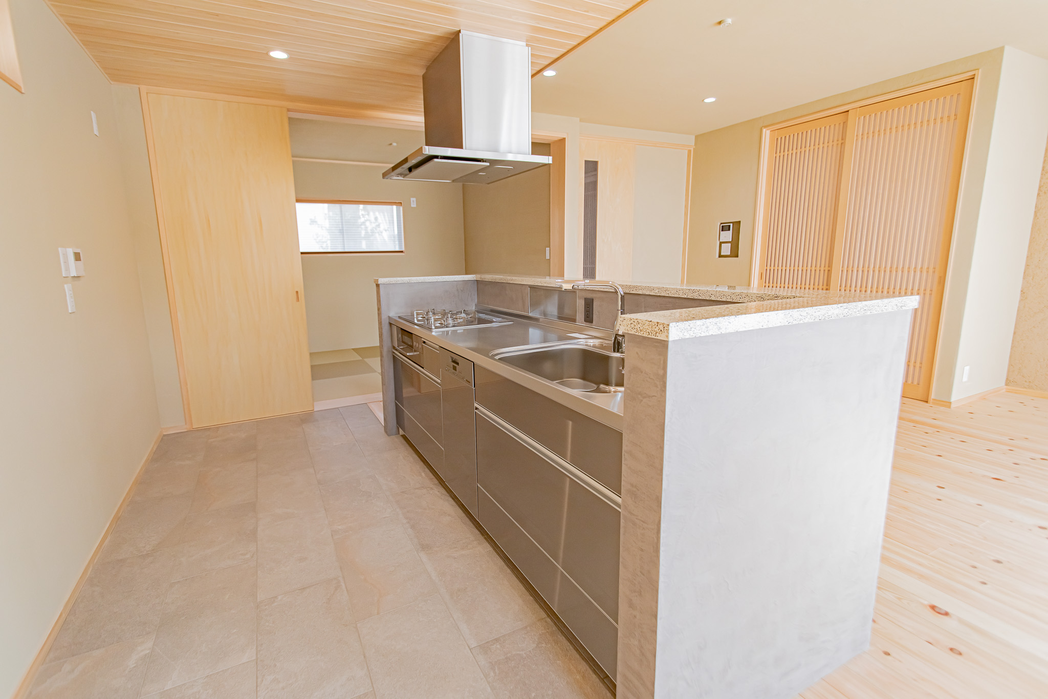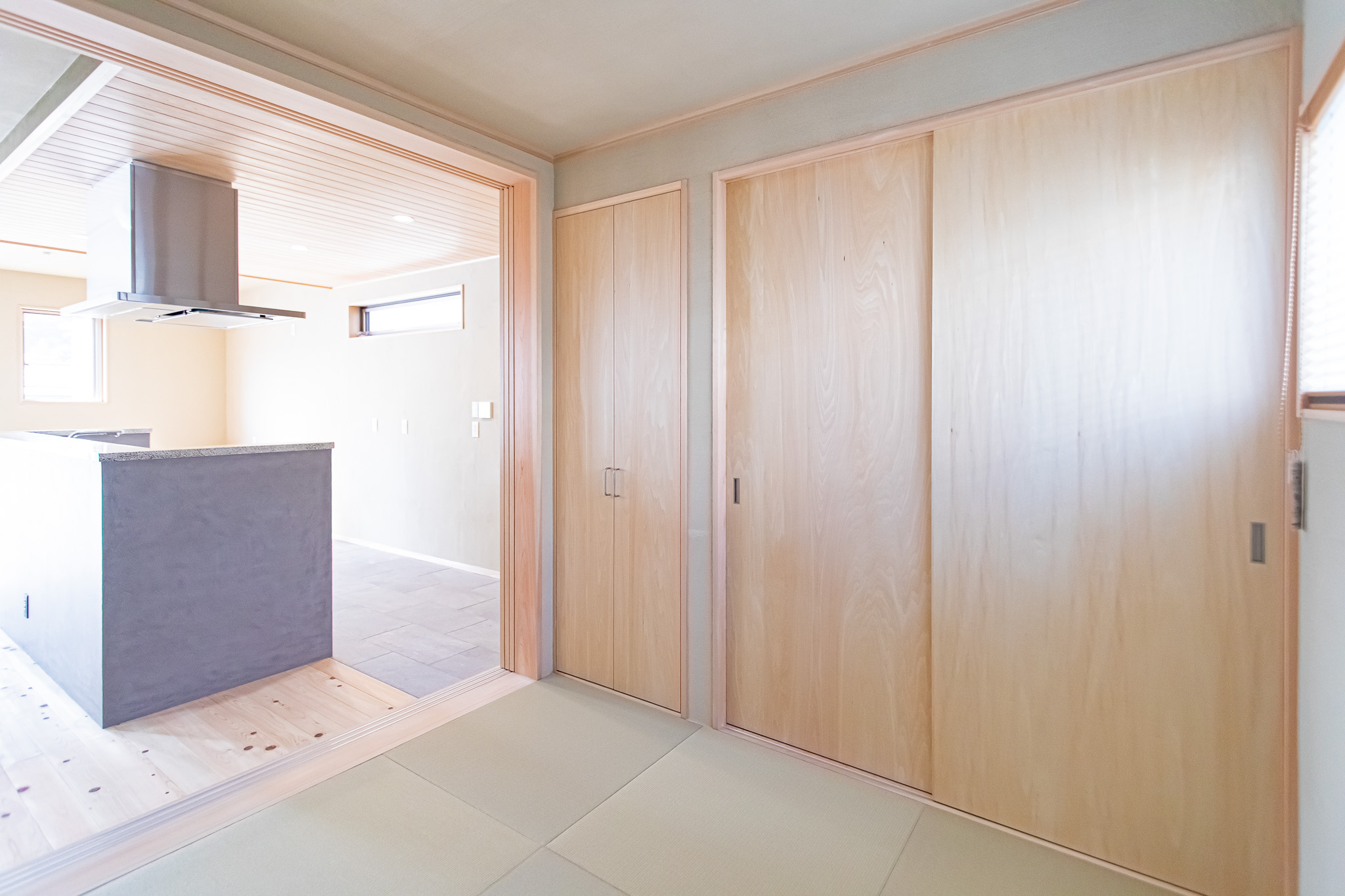 通常の木造住宅ではほぼ不可能とされる大スパンの柱無しLDKを、桧のたいこ梁+技術と工夫で実現しました。