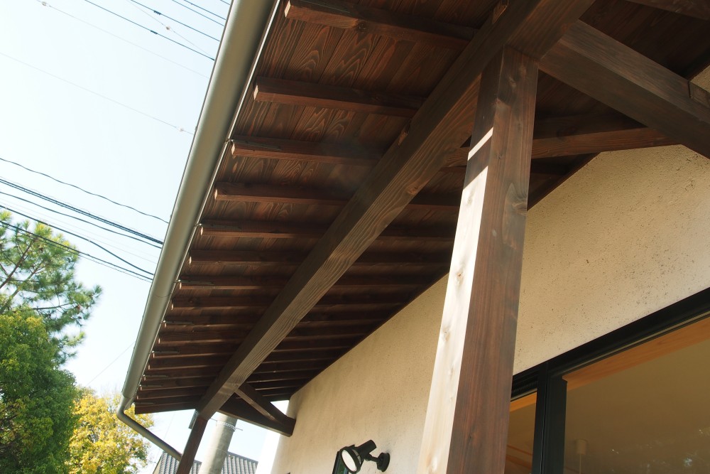 ①柿シブ塗料 ②桧無垢床材 ③シラス壁 ④軒&よろい張り ⑤三州釉薬瓦 ⑥モルタルカウンターキッチン