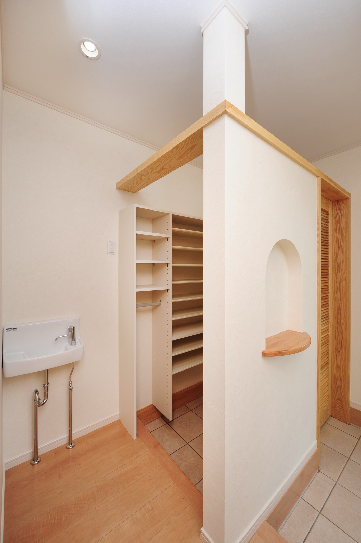 土間収納の横には、手洗いを設けています。家に入ってすぐに手洗いをすることで家族の健康に配慮。